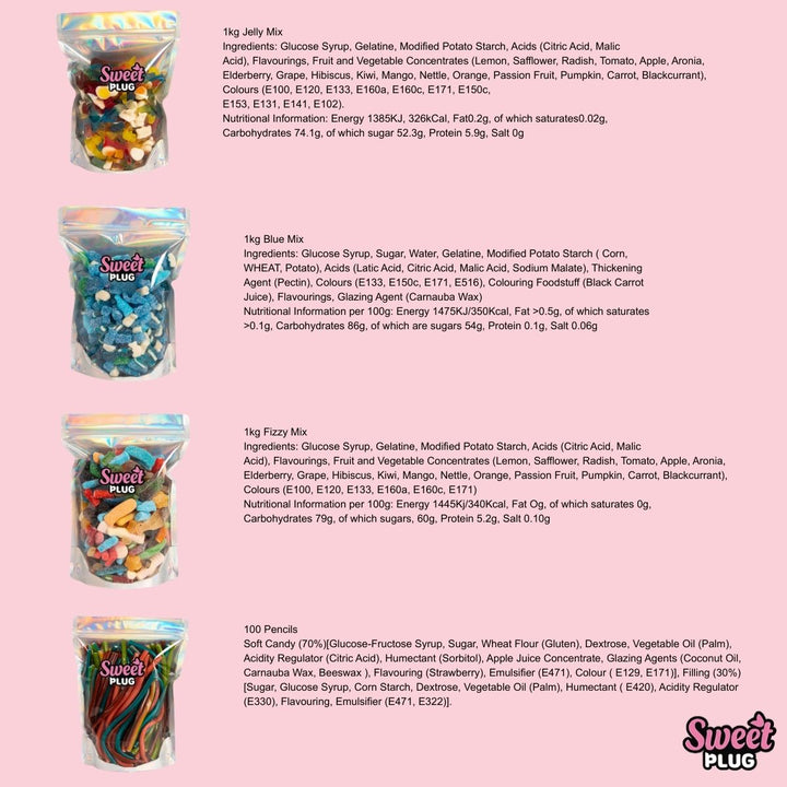 Get ready for the ultimate sugar rush with our 4kg Sweet Bundle! Bursting with flavour and fun, this mega mix includes 1kg of sour fizzy favourites, 1kg of bright blue sweets, 1kg of juicy jelly treats, and 100 fruity pencils — all in one unbeatable bundle.