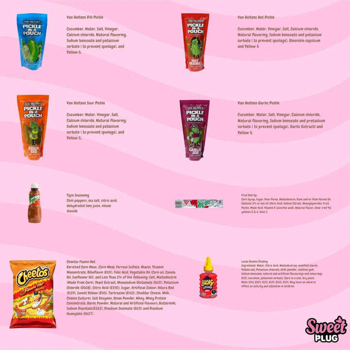 Dill, Big Papa, Hot Mama, Sour Sis, Hot, Sour, Kosher, Garlic Joe, Tapatio, Warhead Sour Dill |