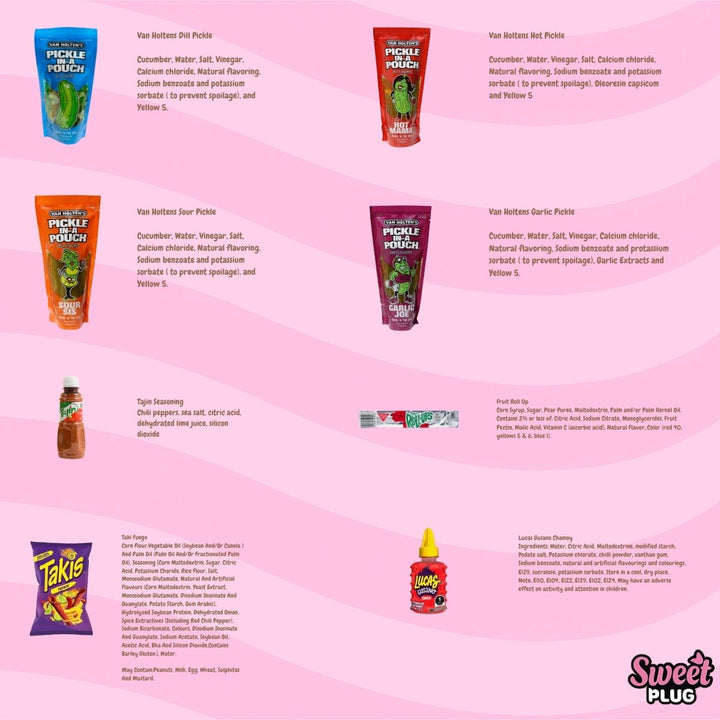 Big Papa, Hot Pickle, Sour Sis, Garlic Joe, Dill Pickle, Hot Mama, Warhead Blue, Mega Chamoy |